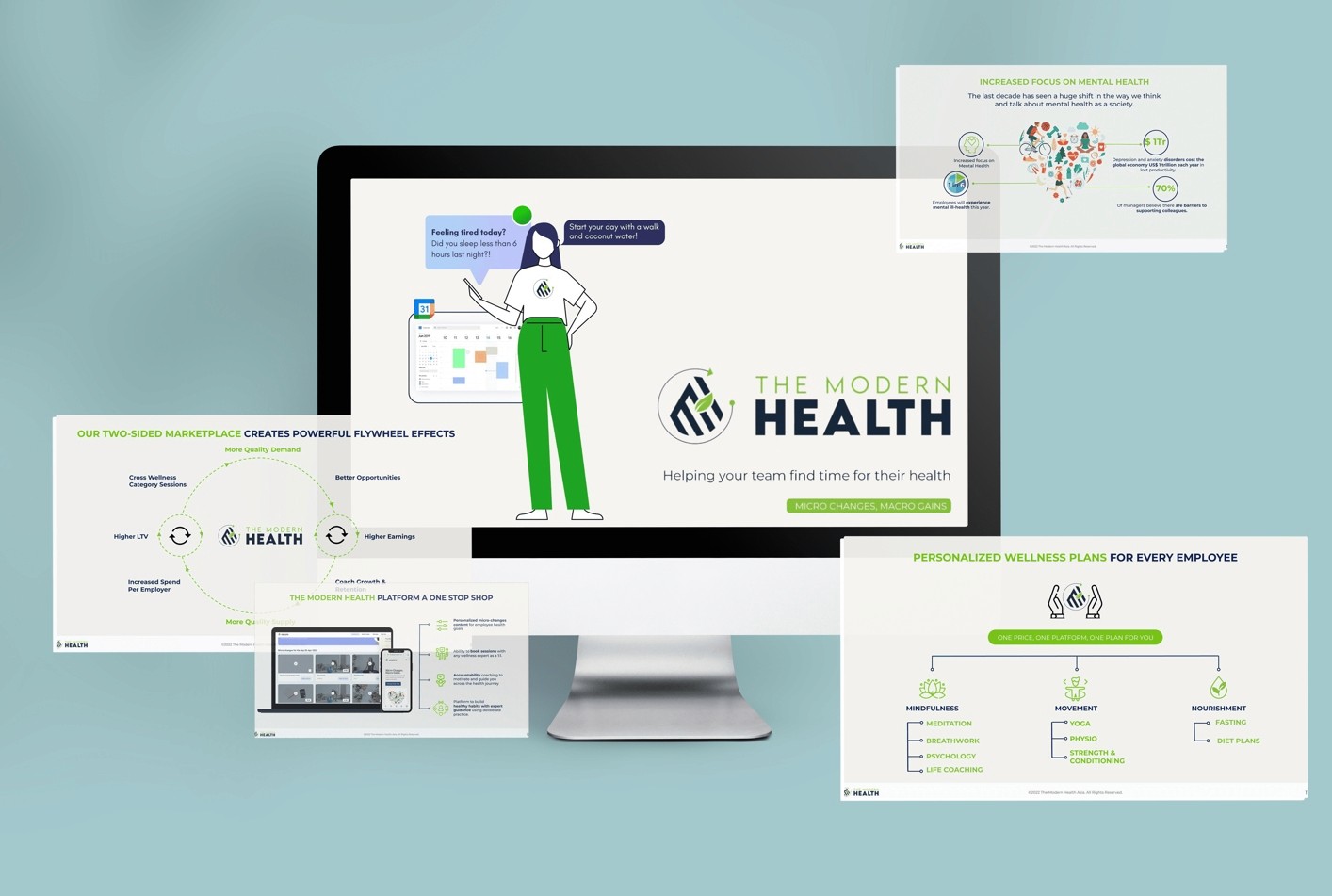 TMH - Pitch Deck was made to precisely put forward the vision of holistic wellness, and breaking down their vision of "Micro Changes, Macro Gains", to help employees all over the world access better work life balance.