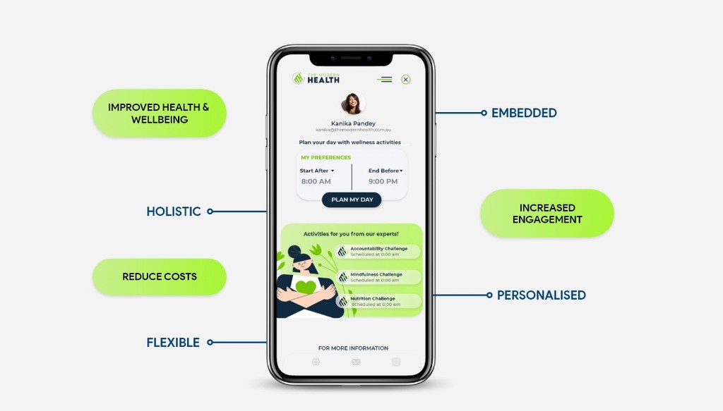The Modern Health is an intelligent holistic fitness and wellness tool that helps you reduce stress at work. TMH is the simplest way of making a meaningful difference to all work related problems such as stress, low energy, lacking intuition to establish the perfect work-life balance, etc.